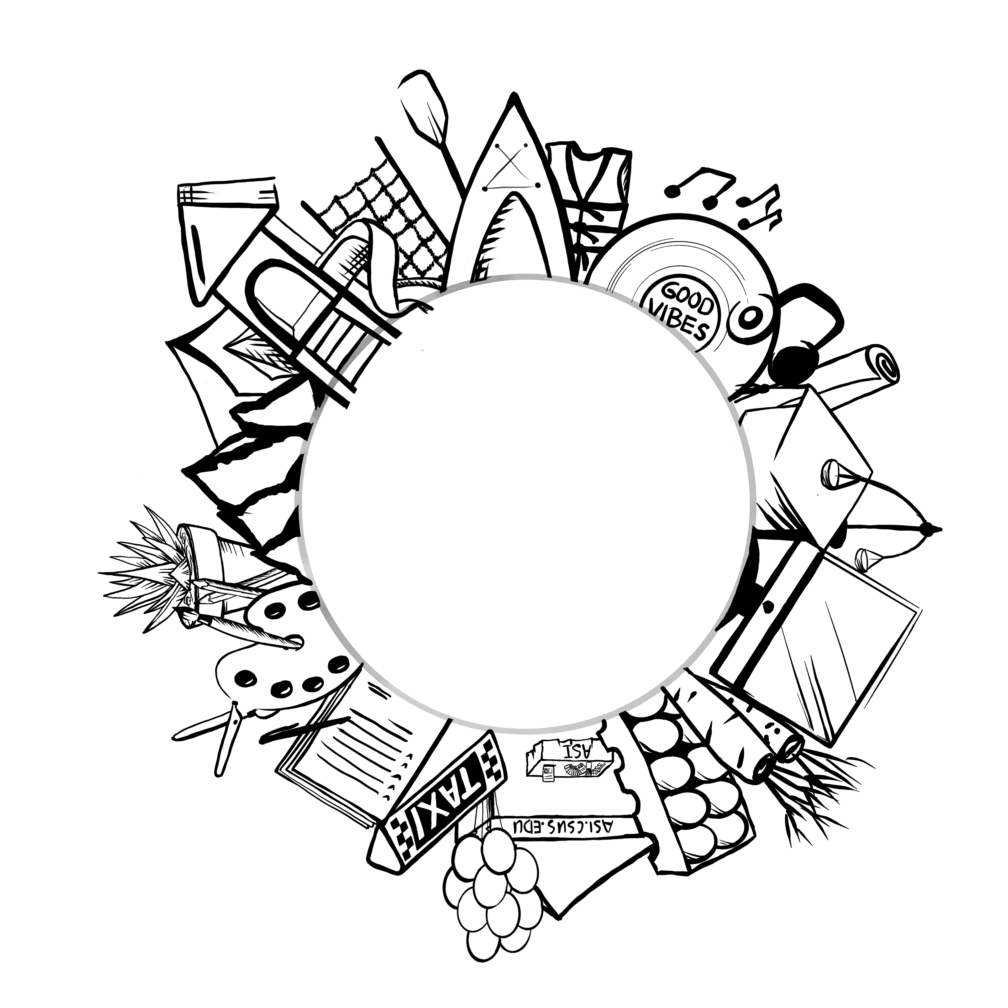 This design began as a simple project to create a black and white mark that would effectively represent Associated Students, Inc. (ASI) and its programs. After some research, I opted for a circular design with the logo at the center and the programs radiating outward from it. I initially sketched it out digitally and later refined it in Illustrator.